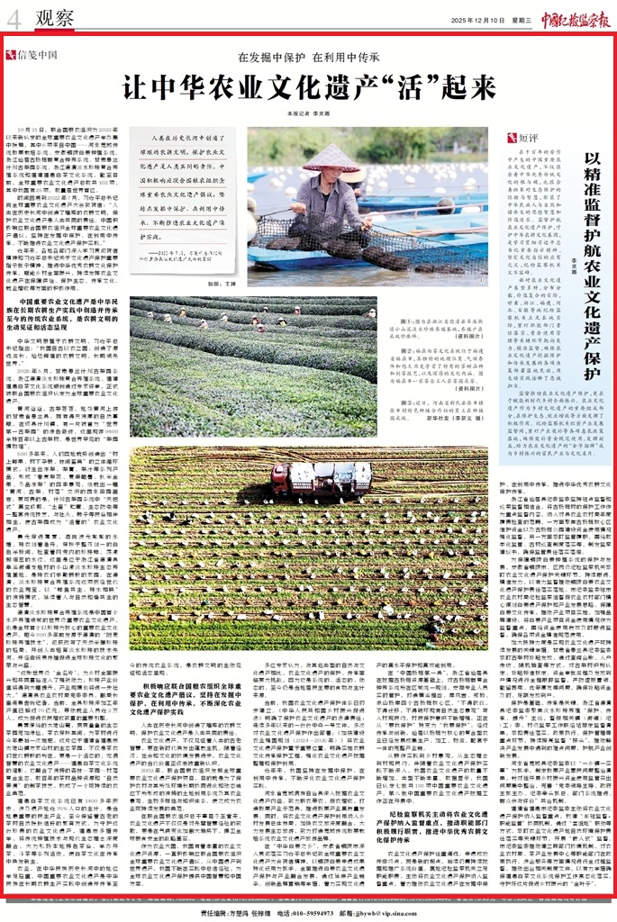 農(nóng)業(yè)文化遺產(chǎn)保護任重道遠。申遺成功并非終點,而是新的起點,后續(xù)仍需持續(xù)挖掘和推廣系統(tǒng)價值。屬地紀檢監(jiān)察機關(guān)立足職能職責(zé),主動將農(nóng)業(yè)文化遺產(chǎn)保護納入監(jiān)督重點,著力推動農(nóng)業(yè)文化遺產(chǎn)在發(fā)掘中保護、在利用中傳承,推進中華優(yōu)秀農(nóng)耕文化保護傳承。