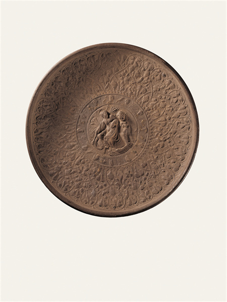 公元2-3世紀(jì),靖遠(yuǎn)縣征集,高4.6厘米,口徑31厘米,足徑10.9厘米。銀質(zhì)鎏金,以鑄造、錘鍱等工藝制成,鎏金已大部脫落。圓形,卷唇,斜孤壁,圈足。盤內(nèi)壁滿飾浮雕花紋,分3圈列置。外圈飾勾聯(lián)的葡萄卷草紋藤蔓,其間棲息30余只禽鳥等動物。中圈外緣飾細(xì)小聯(lián)珠紋,內(nèi)周環(huán)列12個頭像,頭像間為禽鳥等動物,或?yàn)橄ED神話中的奧林匹斯山12神。中心為一高浮雕裸體男性,卷發(fā)無須,身披長巾,右手持圖爾索斯杖,杖首為松果狀飾物,為希臘神話中的酒神狄俄尼索斯。酒神倚一花豹而坐,鼻梁凸出,側(cè)首張口,頸下帶花環(huán),身上遍布圓斑。盤底圈足內(nèi)有一行刻作虛點(diǎn)的銘文,銘文年代晚于做器年代。此件器物發(fā)現(xiàn)于絲綢之路甘肅段的黃河渡口,是研究中西交流重要的實(shí)物資料,也是十分罕見的絲綢之路遺珍。