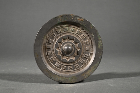漢代,直徑9.7厘米。半圓形背鈕,鈕周飾連弧紋,外圈一周銘文,背沿寬平。銅鏡正衣冠、明是非,“昭明”即“內(nèi)清質以昭明,光輝象夫日月”,以潔凈光明的鏡面為象征,表達了人們潔身自好的精神追求。