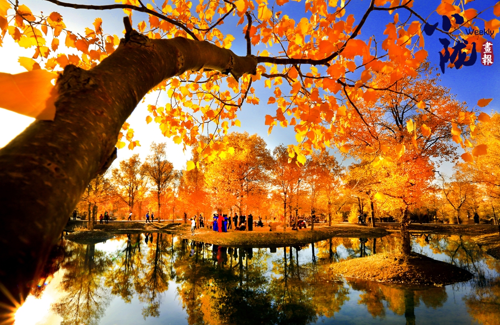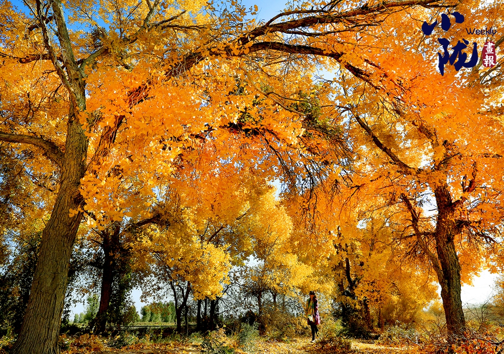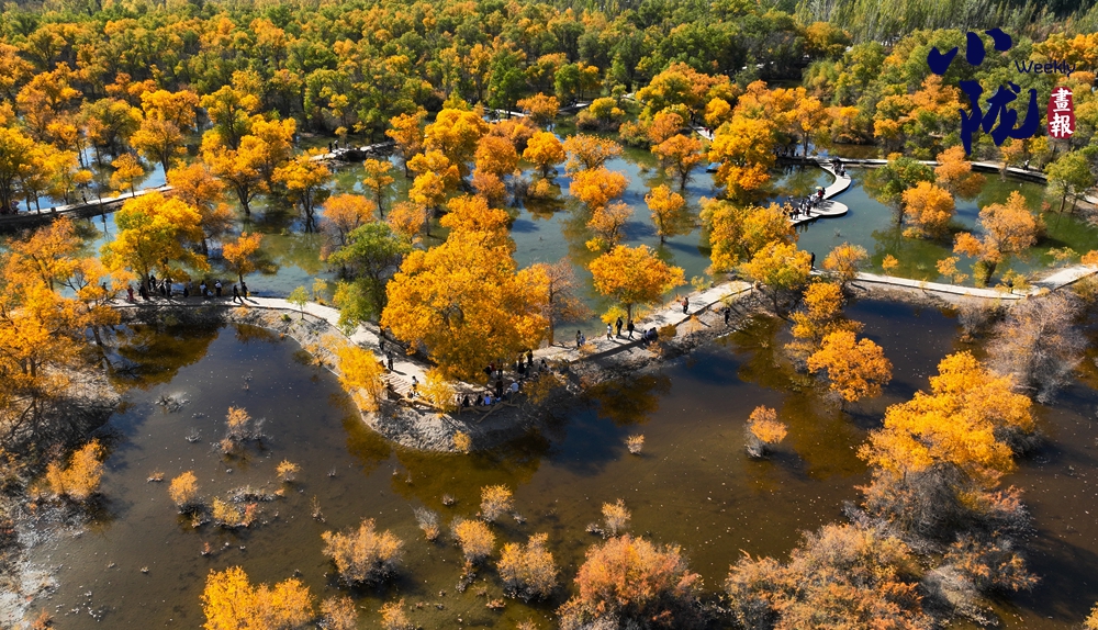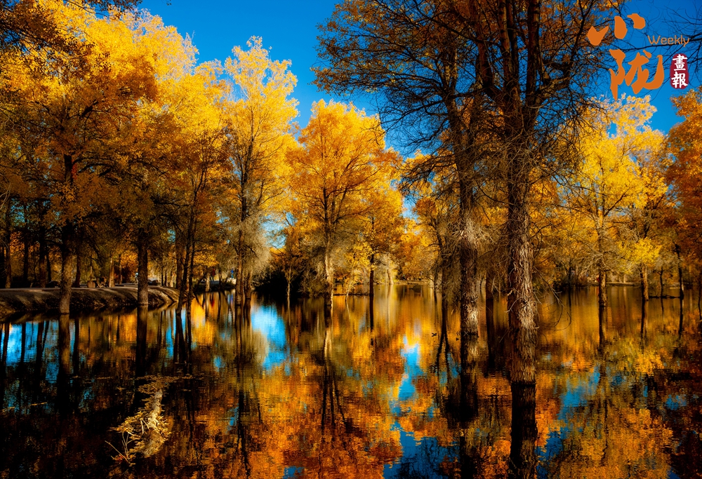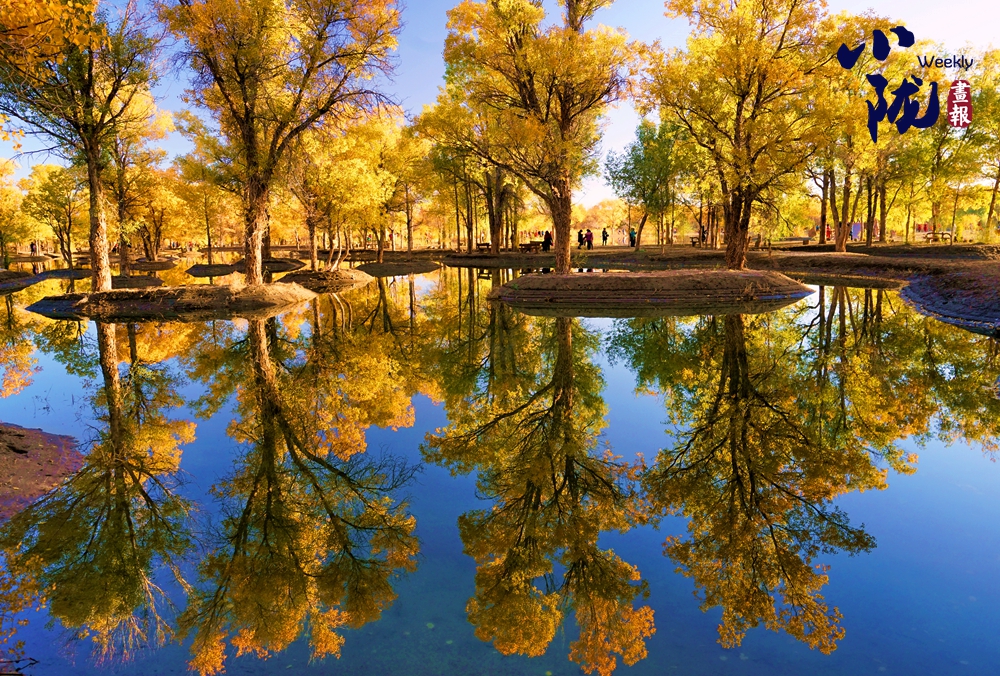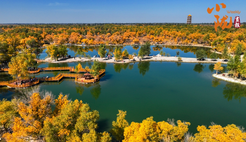 胡楊茂盛,疊翠流金,裊裊身姿倒影湖中。風(fēng)一吹,樹梢輕顫,成千上萬片葉子像被點燃的火焰,在藍得沒有一絲雜質(zhì)的天空下翻涌、跳躍,充滿詩意。林間小道上,游客悠閑漫步,盡享美好時光。
