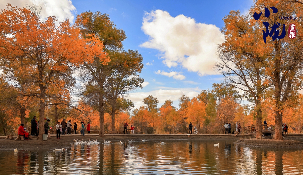 碧波蕩漾的金波湖倒映著胡楊,形成水中有林、林中有水的絕美畫面。游人如織,小橋流水,碧波蕩漾,白鵝嬉戲,若不是周邊金黃色的胡楊提醒,會讓人誤以為來到了江南水鄉(xiāng)。