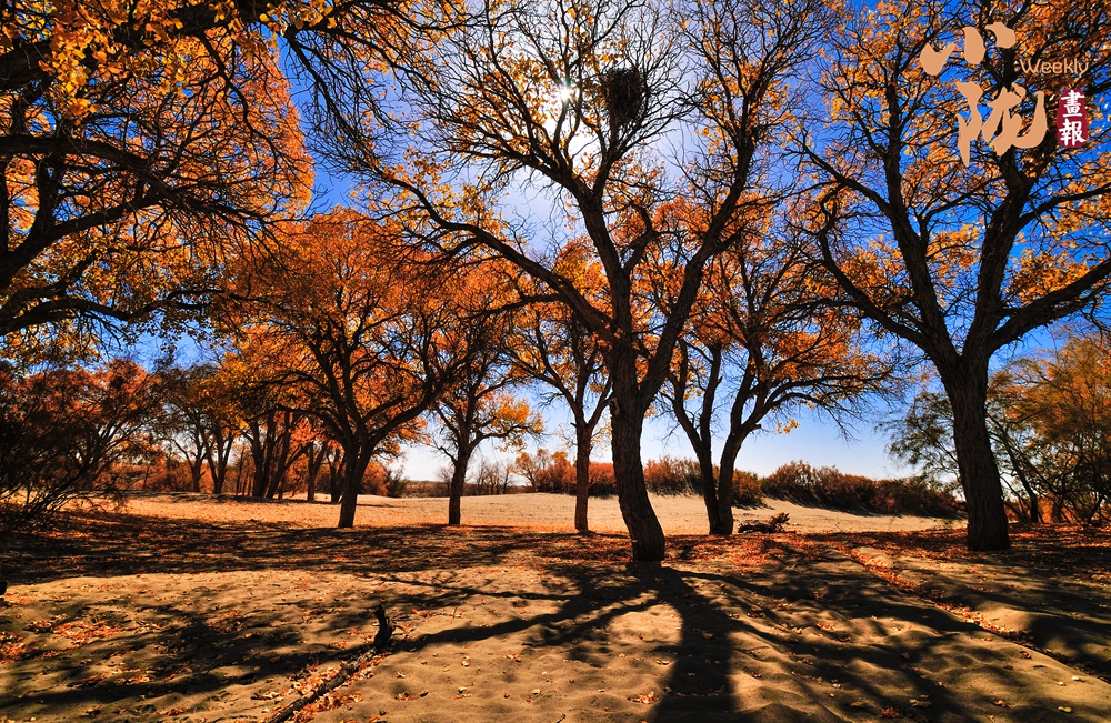 陽光下,金色的樹葉映襯著湛藍的天空,在風(fēng)中婆娑起舞,把整個沙海點綴得生機勃勃。這個秋日,來金塔胡楊林,赴一場千年之約,享受“碧云天,黃葉地,秋色連波,波上寒煙翠”的視覺盛宴。
