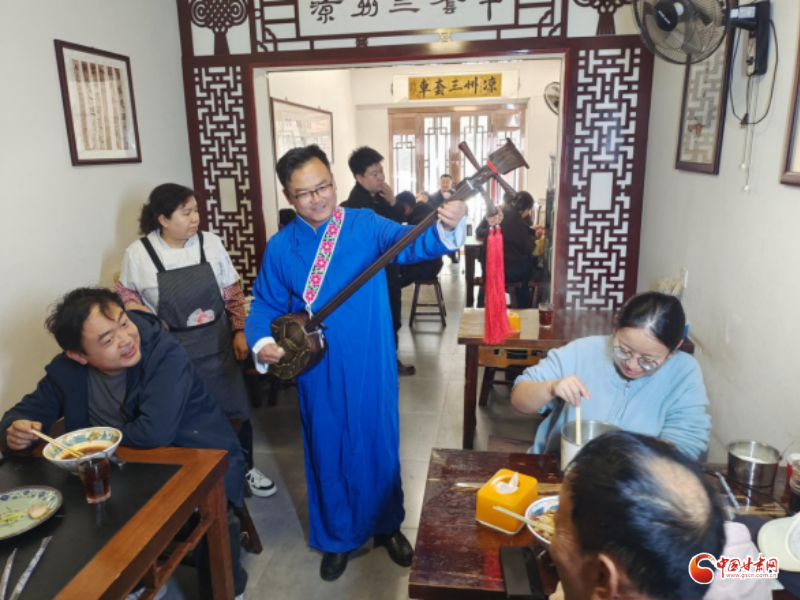 當(dāng)日,北關(guān)市場內(nèi)人流如注、熙熙攘攘,眾多游客與市民齊聚于此,享受美味的同時觀看涼州賢孝和永昌滾燈,涼州賢孝傳承人賈旭峰與用餐的游客進行了互動,人們安逸地享受著這份獨具涼州特色的煙火美味。