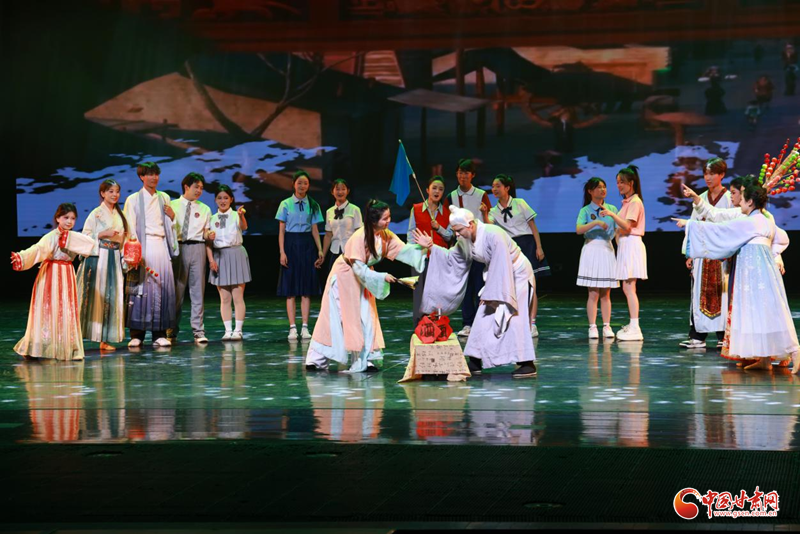 詩會以涼州詞為核心意象,主體分為“涼州·思”“涼州·行”“涼州·吟”“涼州·樂”四個篇章,各有側重又層層遞進,全方位展現(xiàn)涼州文化的多元魅力。第一篇章“涼州·思”以《天馬歌》的朗誦、《邊塞詩情》的情景劇與《鼓韻風華》的表演,共同勾勒天馬傳奇與戍邊情懷,展現(xiàn)涼州深沉雄健的文化基因;第二篇章“涼州·行”借助AI主持與情景演繹,串聯(lián)起情景劇《跟著詩詞游武威》,以科技+文旅的視角,帶領觀眾開啟了一場沉浸式漫游;第三篇“涼州·吟”以《西涼樂舞》、音詩畫《涼州詞》等多元舞臺形式吟誦涼州詞章的雋永風流,對誦表演《古涼新韻》,以“古今對話”解鎖涼州文化密碼,誦讀者交替誦讀“舊八景”與“新八景”組詩,從《大云晚鐘》《黃羊秋牧》等古景詩,到《河西都會》《摘星小鎮(zhèn)》等新景作,舞臺上“聲、形、畫、墨”交織,盡顯涼州古今風貌,引得觀眾沉醉鼓掌;第四篇“涼州·樂”情景再現(xiàn)了《涼州夜宴》,品味葡萄美酒中的絲路情韻;尾聲“詩意涼州·藝游武威”,全場共同唱響對涼州的禮贊,并以“等你在涼州”發(fā)出誠摯邀約,讓千年涼州的詩意與魅力,在新時代持續(xù)綻放光彩。