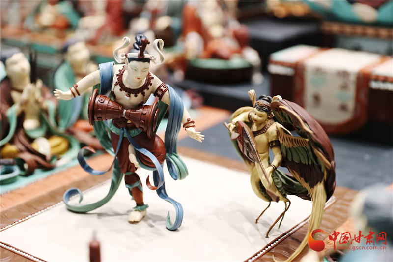 今年蘭洽會甘肅非遺館,正中央的敦煌文化題材《觀無量壽經(jīng)變》面塑受到客商全員追捧。經(jīng)過這里的人都會駐足欣賞,感受面塑藝術(shù)的精彩絕倫,其中,敦煌題材的面塑,飛天人物似乎從壁畫里飛了出來,栩栩如生。