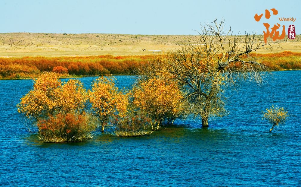 金色胡楊在陽光下泛著溫暖光澤,斑斕絢麗的蘆葦如金色絲帶點(diǎn)綴荒漠,與碧綠河水、湛藍(lán)天空構(gòu)成濃墨重彩的秋日圖景。