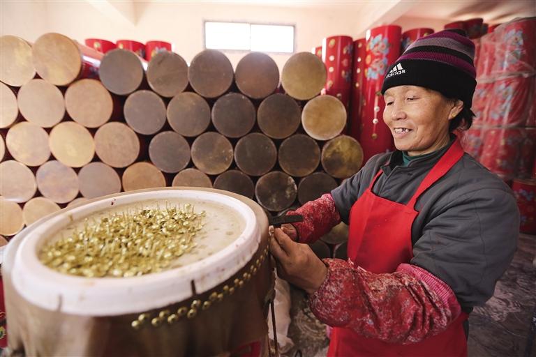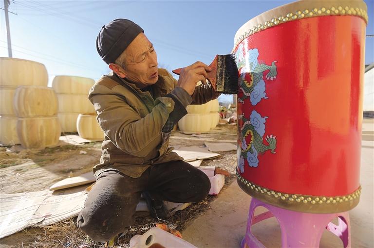 冬日農(nóng)閑時節(jié),在甘肅省定西市安定區(qū)鳳翔鎮(zhèn)北廿鋪村,牛皮鼓手工制作藝人利用晴好天氣趕制訂單牛皮鼓,供應(yīng)市場。該村每年可制作各類牛皮鼓3000余面,牛皮鼓手工制作涵蓋選材、解板、刨制鼓腔、蒙皮、釘釘?shù)榷嗟拦ば?,再?jīng)數(shù)天晾曬和反復(fù)調(diào)試才能最終制成。牛皮鼓是我國的傳統(tǒng)打擊樂器,在西北地區(qū)用于民間社火表演等活動。