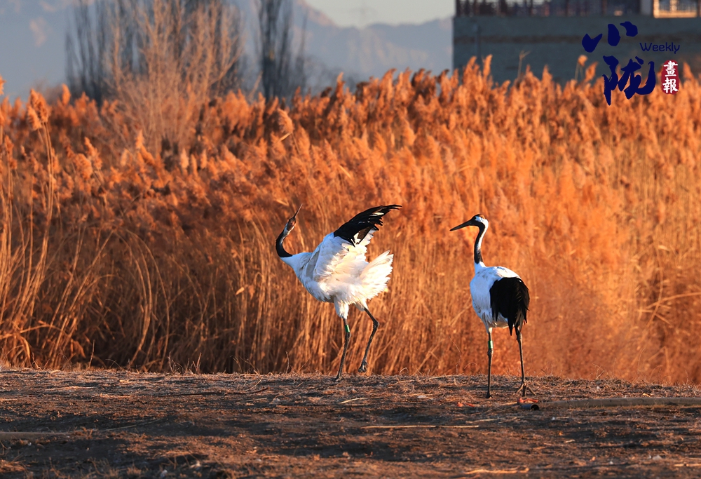 兩只鶴相對而立,輕輕躍起,翅膀半展,脖頸交纏,仿佛在演繹一段冬日戀歌。