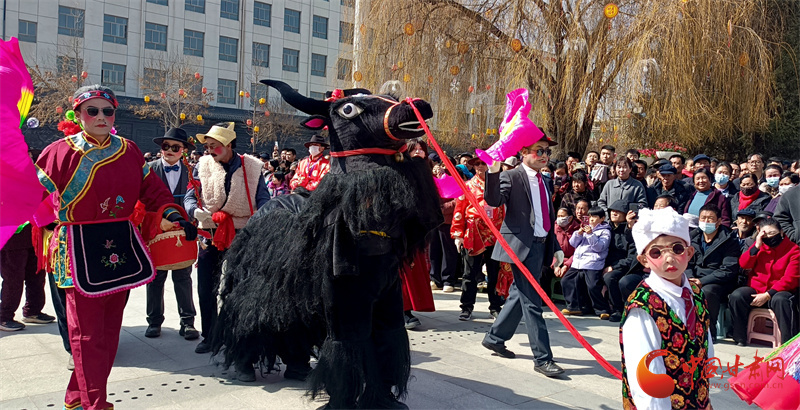 演出場上,雄獅、金龍、高蹺、春牛伴著春風舞動,太平鼓、嗩吶、銅鈸奏響新春旋律,生動再現(xiàn)了和政群眾蒸蒸日上的幸福生活。演員們扮相精致、身姿靈動,高蹺表演者彩扇輕搖、絲巾飛舞,盡顯民間藝術(shù)的獨特韻味。