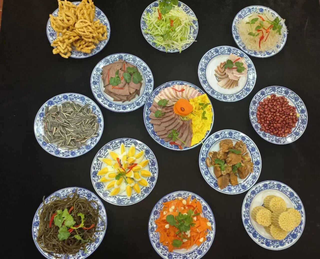 以常見(jiàn)的“十三花”為例,“十三花”,即十二個(gè)佐酒涼菜,加一旋菜全盤(pán)。整體具有太陽(yáng)花或旋轉(zhuǎn)八卦意象,遂美稱(chēng)為“花”。