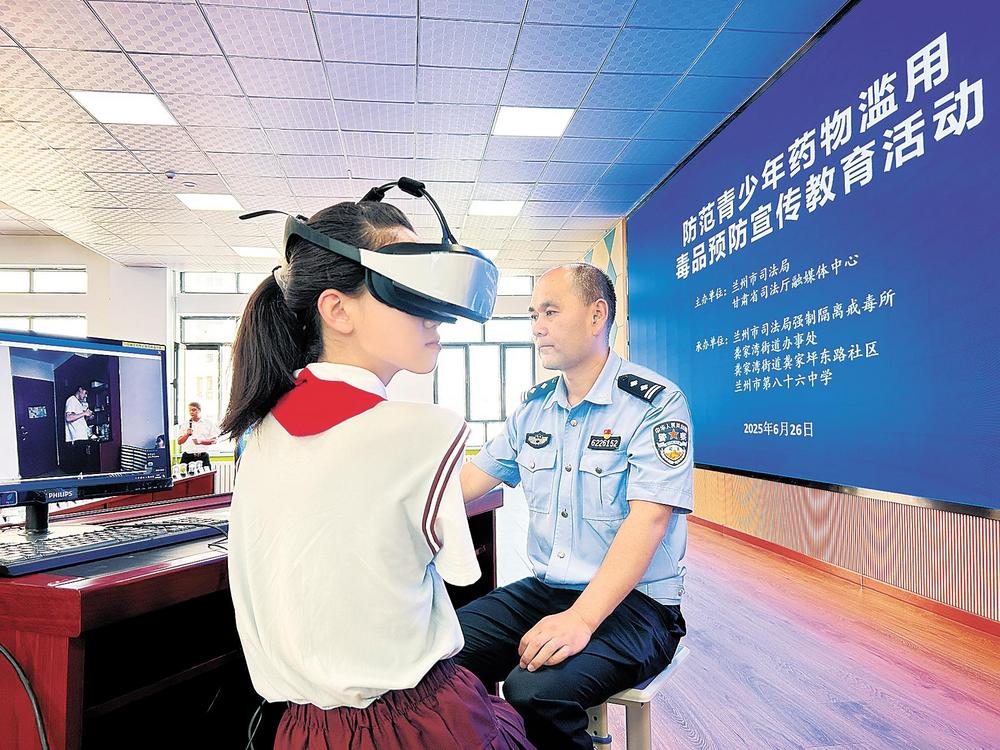 2025年6月26日,蘭州市司法局強制隔離戒毒所干警走進蘭州市第八十六中學開展禁毒宣傳教育。圖為學生佩戴VR眼鏡,通過虛擬現(xiàn)實技術創(chuàng)造逼真的沾染毒品場景,讓學生身臨其境地感受毒品的危害。