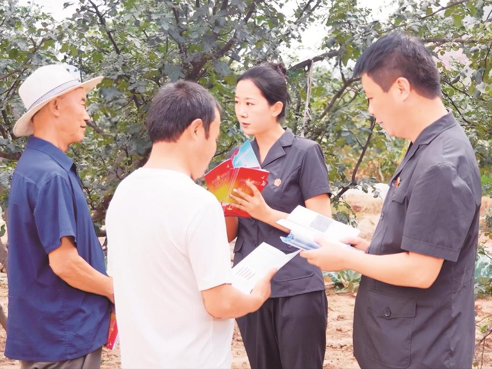 三河法庭干警深入田間地頭,向村民發(fā)放法律宣傳手冊(cè)。武都區(qū)法院供圖