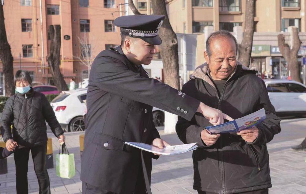 張峰天(中)向群眾宣傳反電詐知識(shí)。