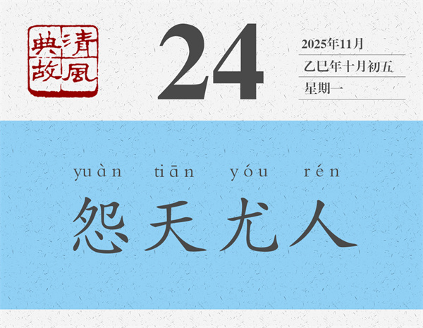 朱熹《論語集注》對“不怨天,不尤人”的理解要簡潔得多,也深刻得多:“不得于天而不怨天,不合于人而不尤人。”《荀子·榮辱》則更進一層:“自知者不怨人,知命者不怨天。”能夠看清自己的人就不會去埋怨別人,那么埋怨誰呢,當(dāng)然是埋怨自己了;能夠知道自己命運的人就不會怪罪于天,那么怪罪誰呢,當(dāng)然是怪罪自己了。后世則反“不怨天,不尤人”之意,而以“怨天尤人”為典,形容遇到不稱心的事情,或者事情不順利的時候,一味埋怨天,一味責(zé)怪別人。言外之意,就是不從主觀上找原因,不在自己身上找問題。宋人李昌齡《太上感應(yīng)篇》:“苛虐其下,恐嚇于他。怨天尤人,呵風(fēng)罵雨。”