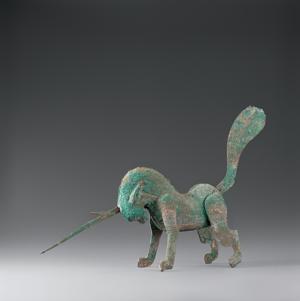 漢代,酒泉市出土,一級(jí)文物。俯首含胸,頸部高聳,頭生獨(dú)角,角向前刺,扁尾高揚(yáng),四足跨張作角斗狀,全身鑄有獸毛紋飾,姿態(tài)威嚴(yán),仿佛隨時(shí)準(zhǔn)備躍起。它是中國古代文化中能夠分辨善惡曲直的“正義的化身”——獬豸。