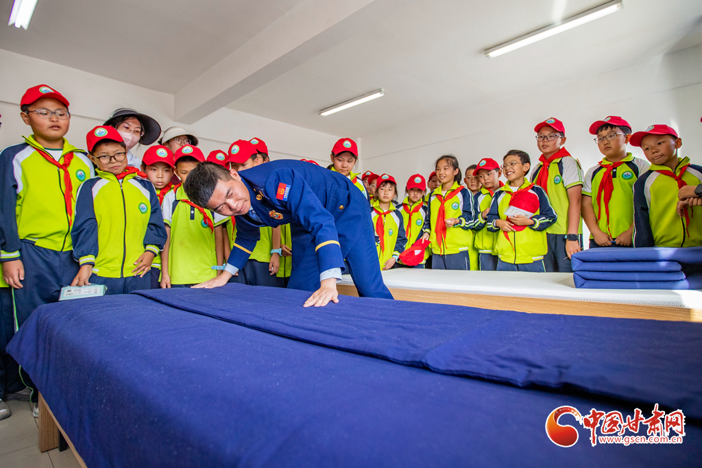 消防隊(duì)員正在為師生們展示內(nèi)務(wù)整理