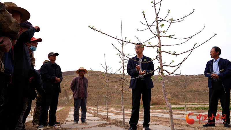 在余灣鄉(xiāng)韓店村、王坪村,靜寧縣果樹果品研究所副所長李鵬鵬正在對近兩年栽植的青砧瑞雪示范園開展幼園管理培訓。