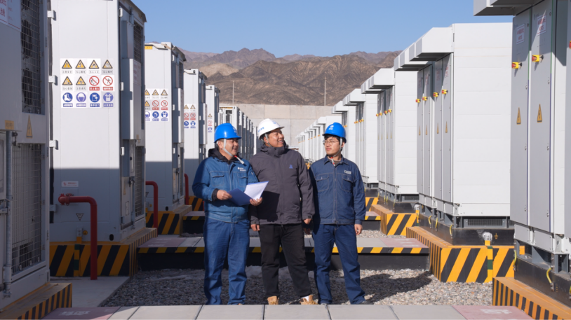 甘肅電力員工在嘉峪關(guān)為全省目前建成并網(wǎng)容量最大的電化學(xué)儲(chǔ)能電站——寧晟500兆瓦1000兆瓦時(shí)獨(dú)立儲(chǔ)能電站開展用電上門檢查服務(wù)。姜欣蓉/攝