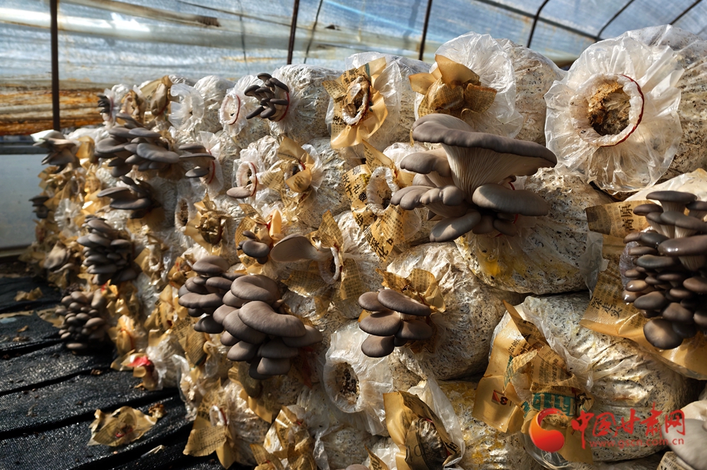 溫室大棚里,袋栽平菇簇?fù)砩L,菌包整齊排列,菌蓋飽滿厚實,滿是豐收的生機
