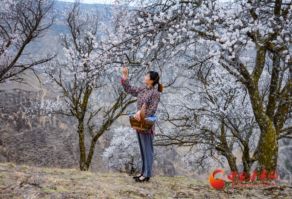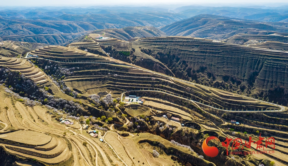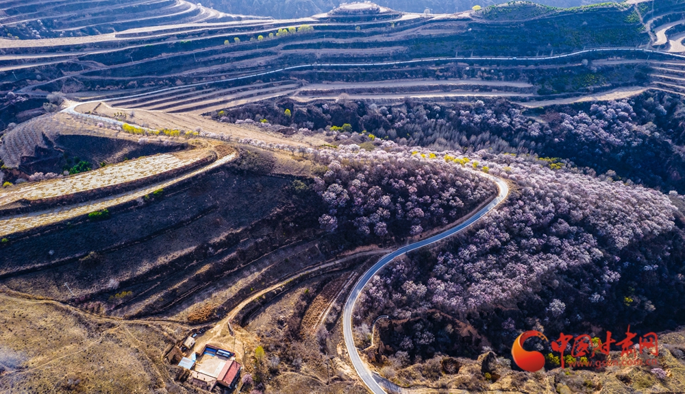 梯田層疊如浪,杏花綴滿山野,黃土坡煥發(fā)生機(jī)