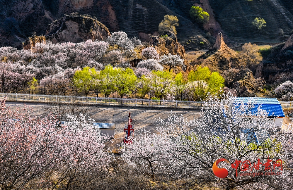 杏花盛放,粉白花海漫過(guò)溝壑,新綠枝椏點(diǎn)綴其間,山野間滿是春日的爛漫與生機(jī)