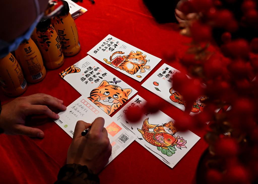 2月6日,市民在明信片上寫下詩(shī)詞。