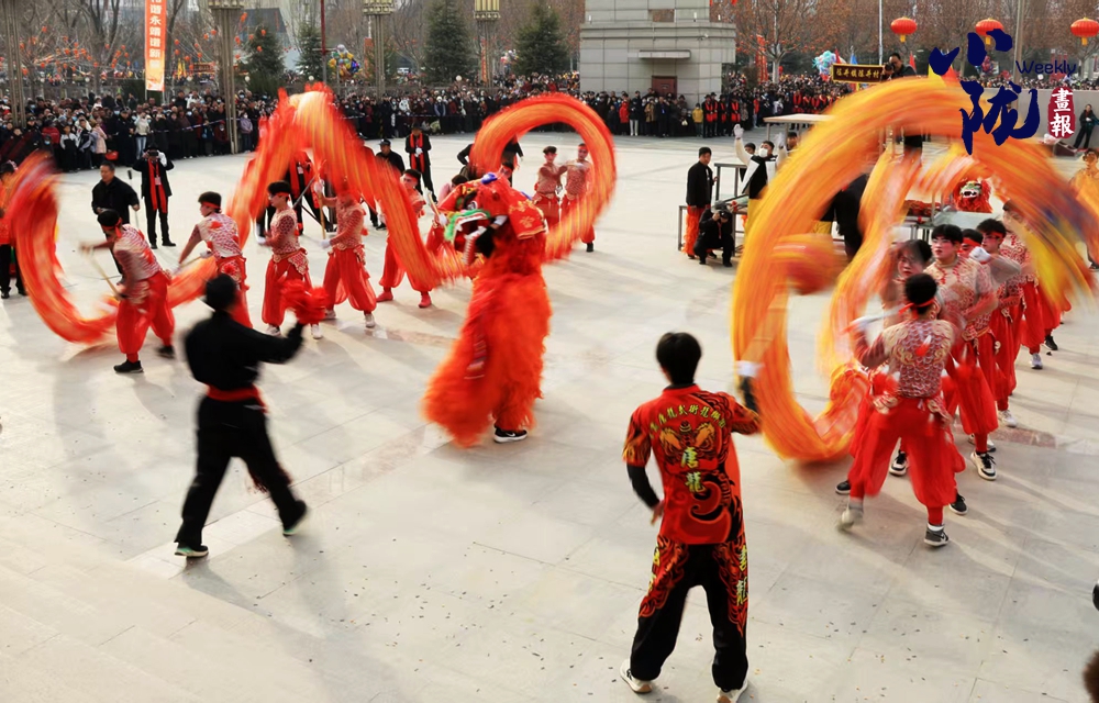 兩條金龍翻江倒海,踏著鼓點蜿蜒游走。舞龍的小伙子們步伐矯健,巨龍在他們的手中時而盤旋昂首,時而穿梭遨游,龍身隨著龍珠上下起伏,氣勢雄武遒勁。